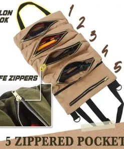 With 5 deep zippered pouch-style pockets, you can categorize a variety of tools including small pillers, screwdrivers, sockets, tire gaugesor flat tools etc. for easier access. Get your tools ready anywhere, anytime without bulky bag- Roll it up and transform from hanging style to a portable duffel bag.