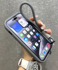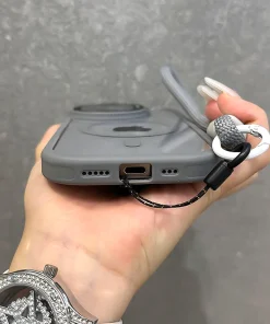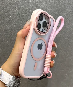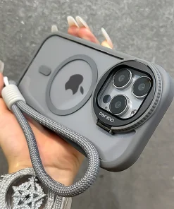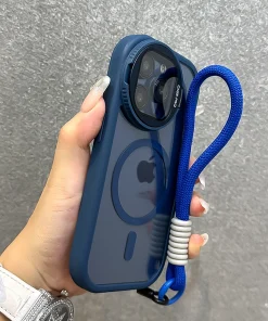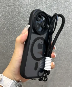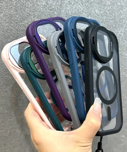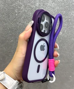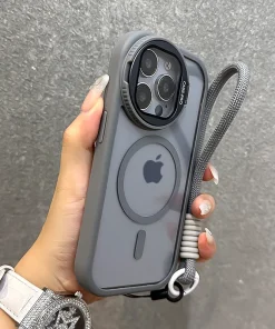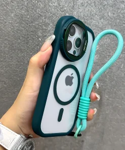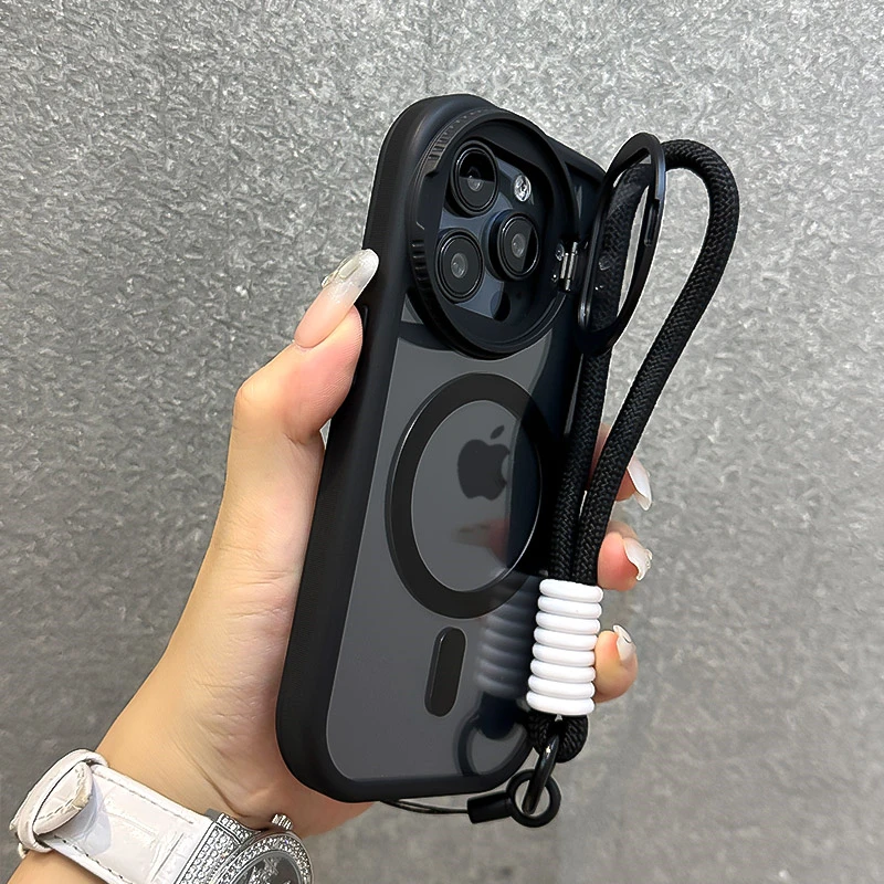 Fold Glass Lens Stand Magnetic Transparent Case For iPhone 15 14 13 12 11 Pro Max For Magsafe Wrist Strap Cord Shockproof Cover