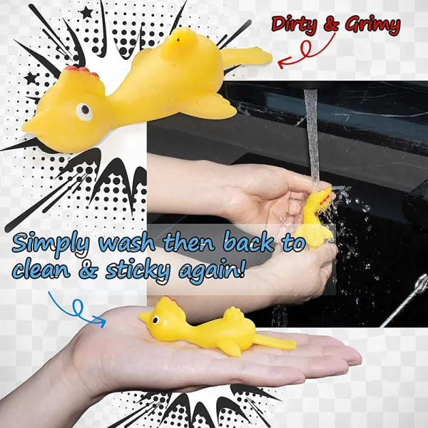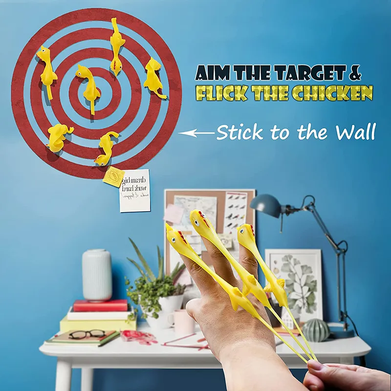 These funny Turkey Slingshot are squishy and sticky. Put your finger under the chin, pull the legs back, and then release to watch it fly, cling to the wall and fall slowly.