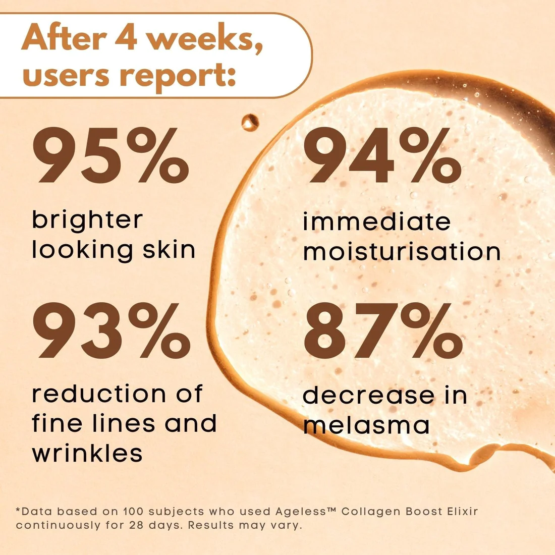 Ultra™ Collagen Boost Elixir operates through a combination of scientifically-supported active ingredients that target the underlying causes of aging skin. The formula is designed to penetrate the dermal layer and provide essential nutrients and hydration to the skin. It works synergistically to provide multiple benefits to the skin, including the reduction of the appearance of fine lines and wrinkles, improvement in skin elasticity and firmness, hydration, and protection from environmental damage.