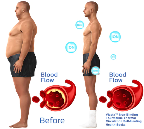 Uncontrolled blood sugar levels can damage veins and may delay the flow of blood through some of the smaller blood vessels in the legs and feet.Viastx™ Non-Binding Tourmaline Thermal Cycle Self-Heating Health Socks are designed to actively push uncontrolled blood from the legs and feet back to the heart, allowing for a healthy and efficient circulation of your blood.