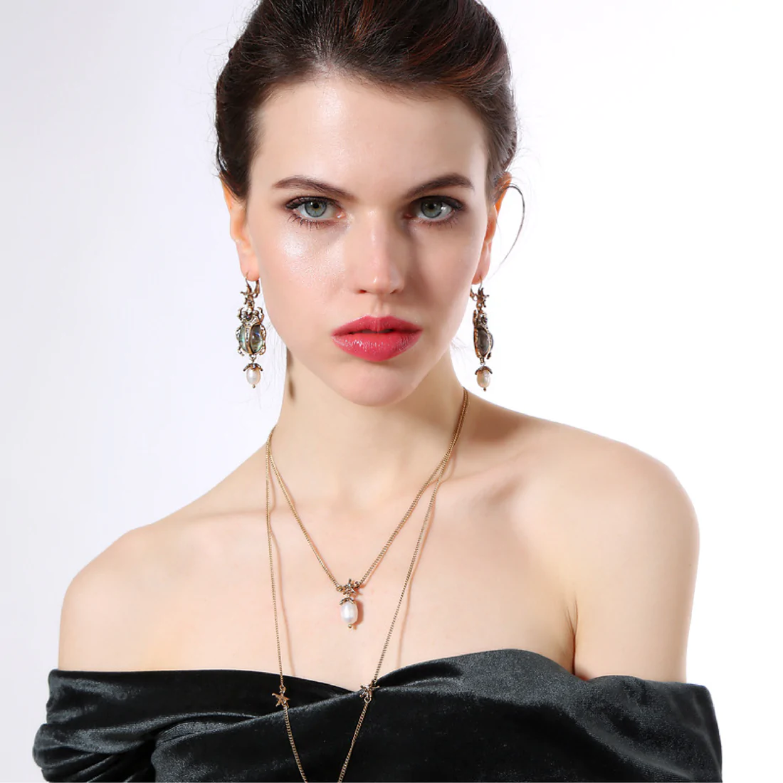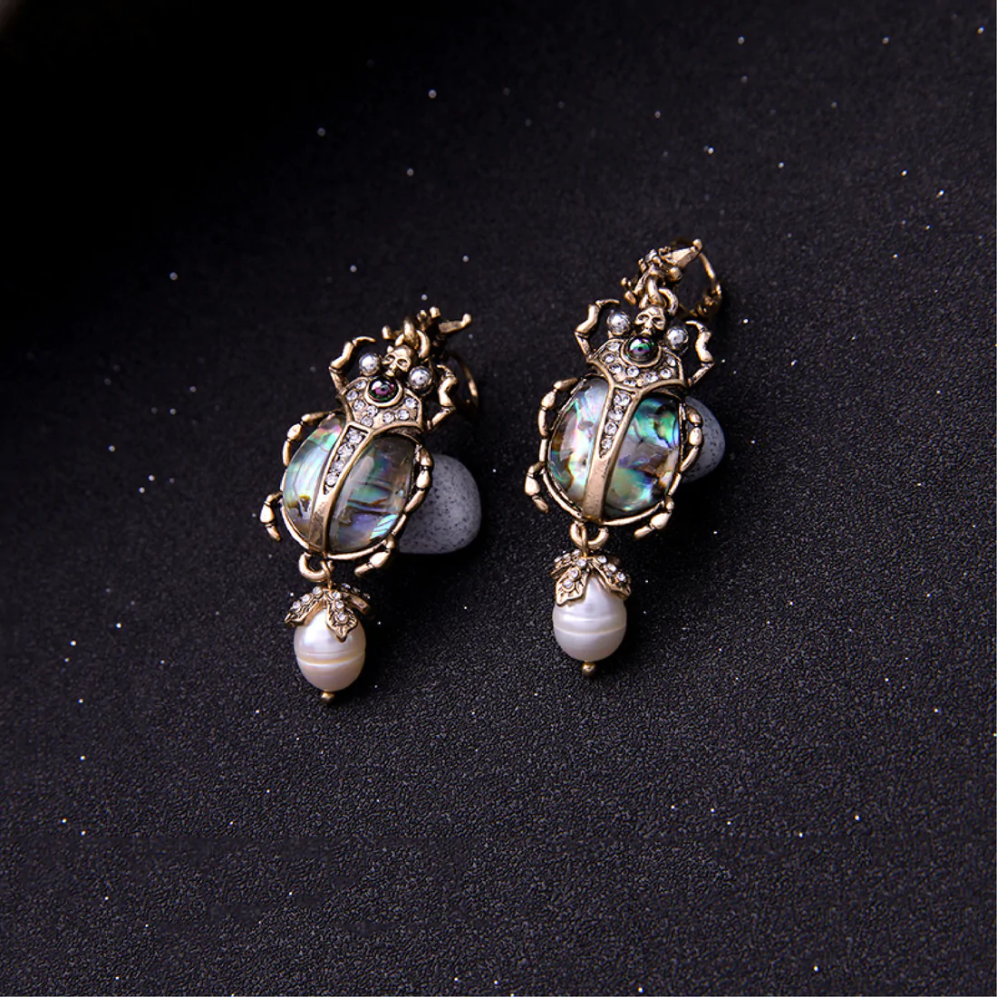 In a retro gold tone, they are designed in a drop style and feature beetles in beautiful holographic color with a chic star stud and a cultured pearl. Add a touch of whimsy to any look with these stunning earrings.