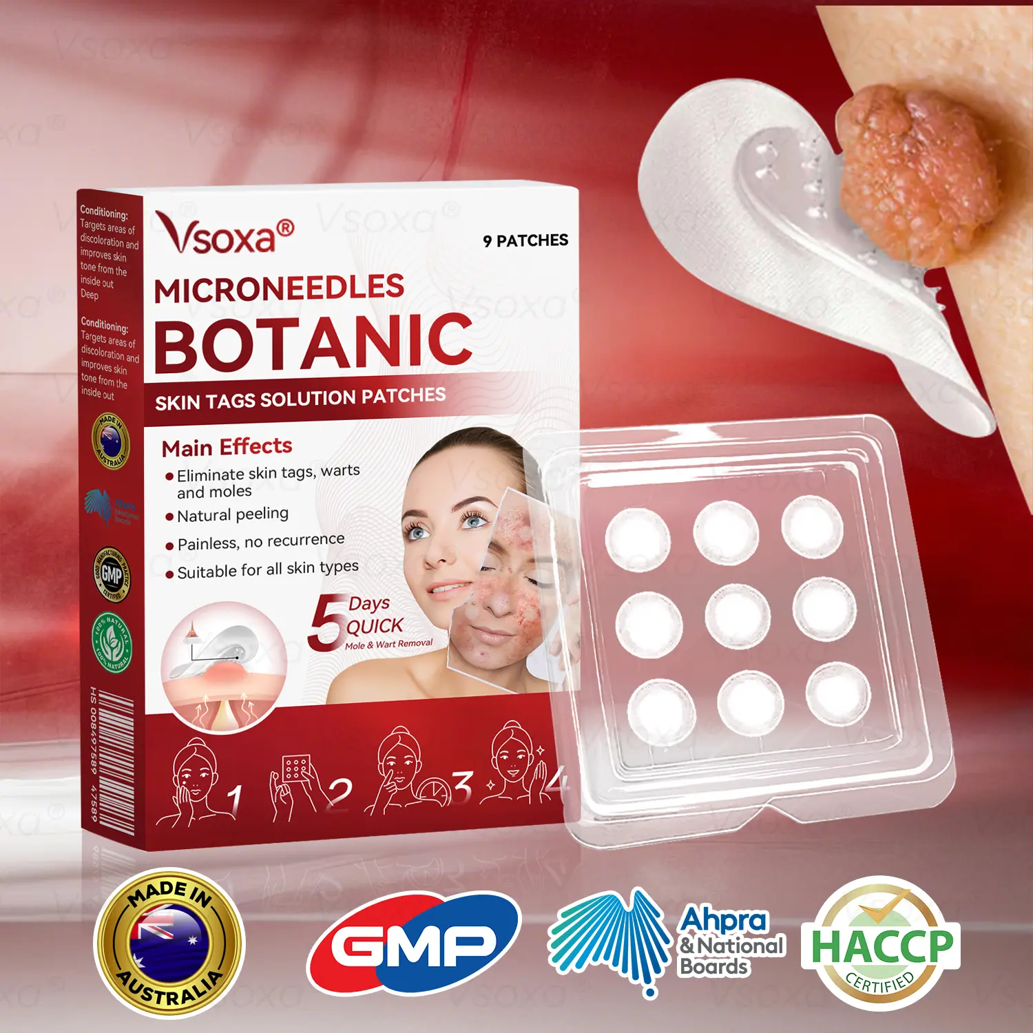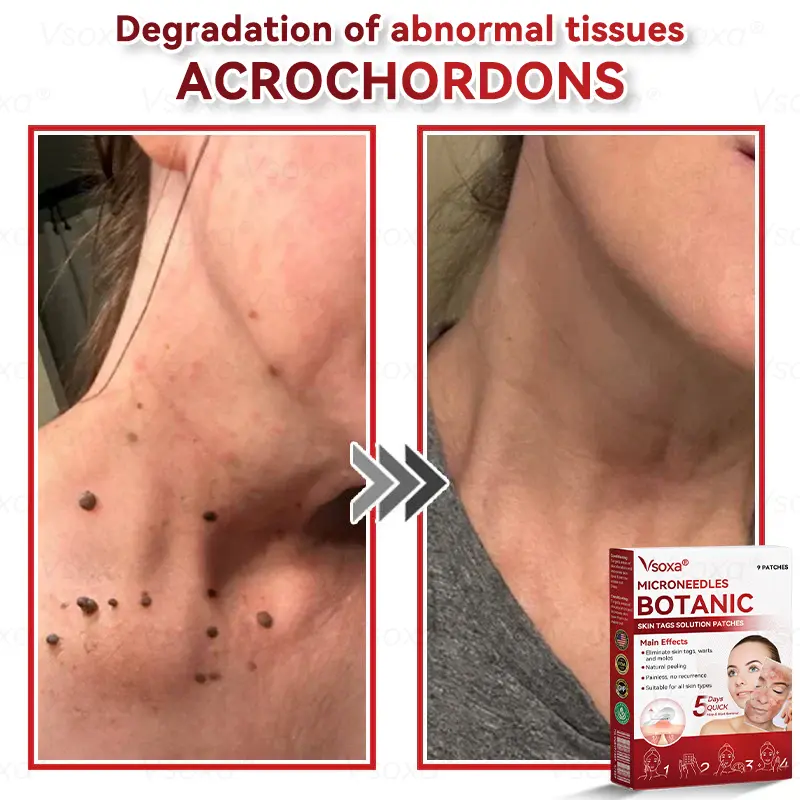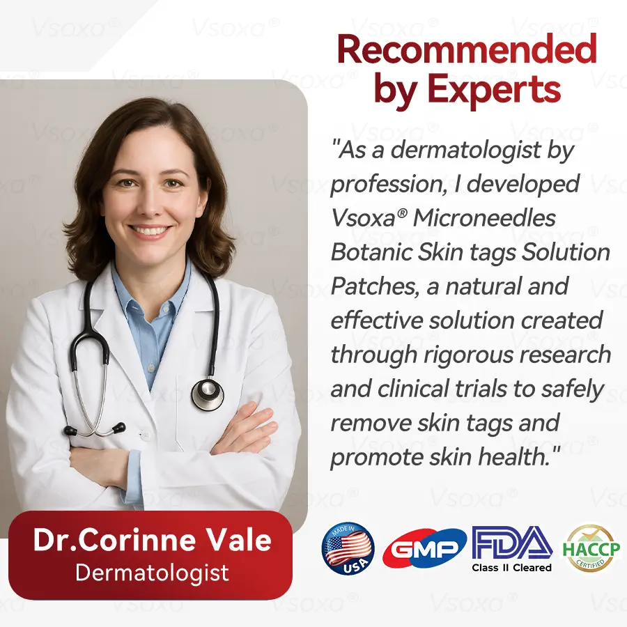 This product has undergone rigorous clinical validation, received FDA approval, and has been recommended by several leading dermatologists. Our R&D team specializes in skin research and is dedicated to advancing the field of treatment and prevention, with decades of clinical and educational experience. Through extensive clinical trials and scientific validation, Vsoxaยฎ Microneedles Botanic Skin Tags Solution Patches have been shown to be effective in improving a wide range of skin conditions including moles, warts, hyperpigmentation, acne, and age spots, as well as dramatically improving the health and appearance of the skin after long-term use. Our clinical certification not only proves the safety of the product, but also confirms its excellent results in skin repair and anti-aging.