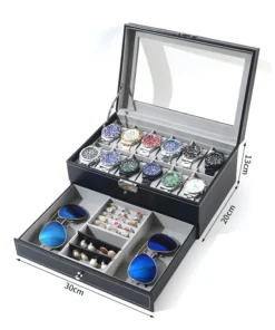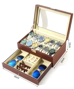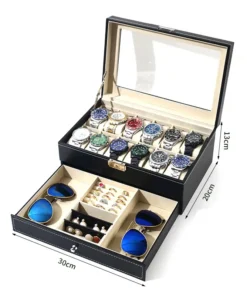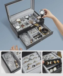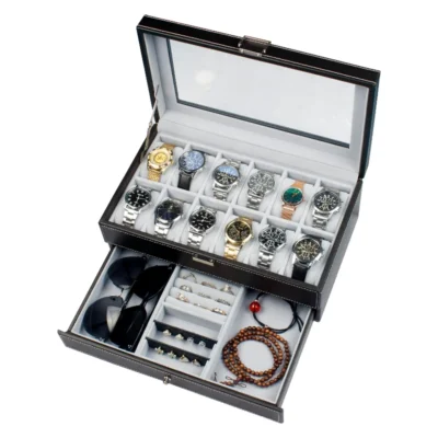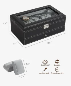 12 Slot PU Leather Lockable Watch Storage Boxes, Men &; Women’s Jewelry Display Drawer Case, 2-tier Organizer Watch Showcase Box