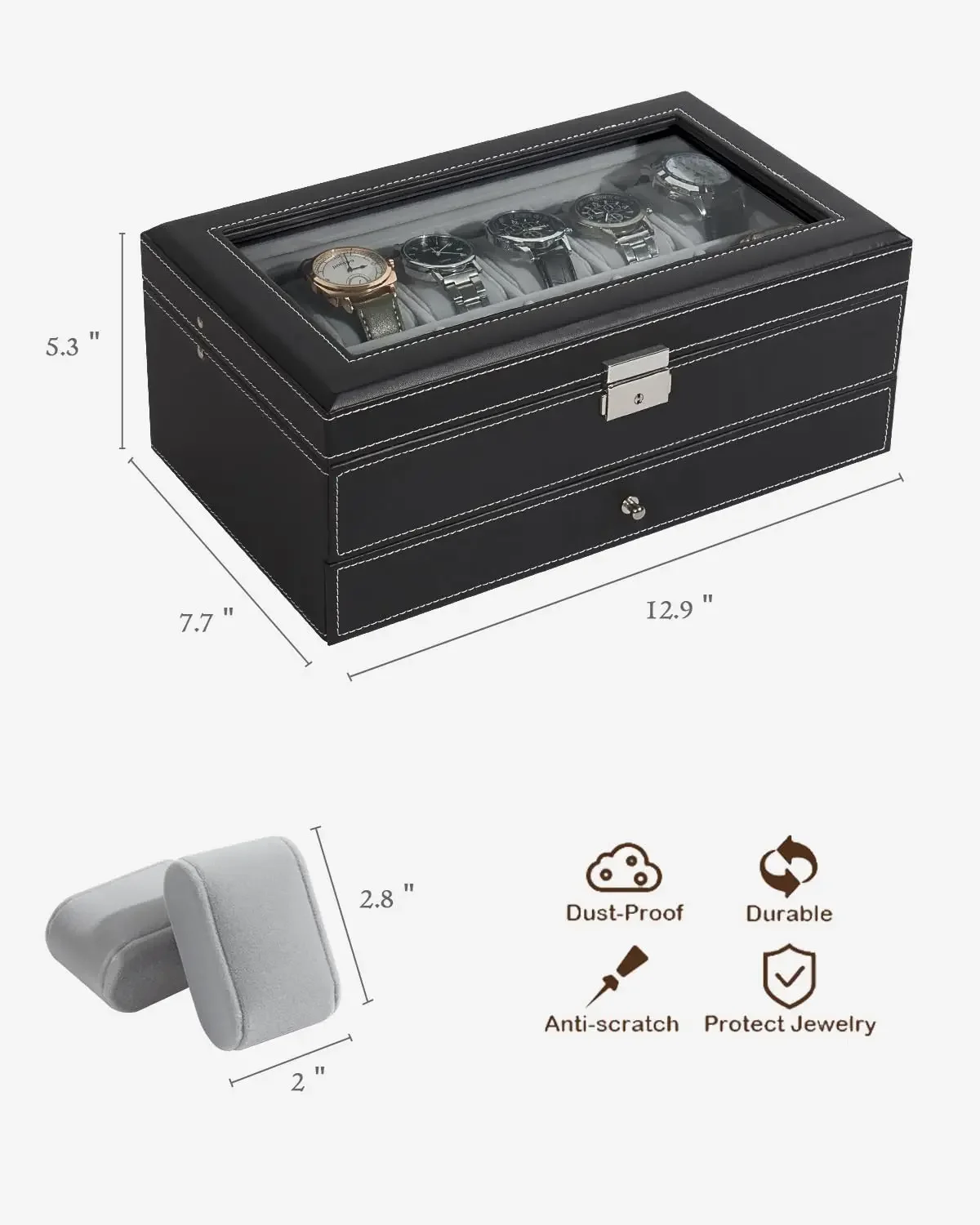 【Real Glass Top】Real glass lid keeps your watches from dust, and easy for you to see all the watches in the box, and helps you decide quickly which watch to wear. It will display all your watches in a convenient, fashionable, and clear way.