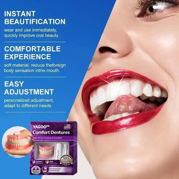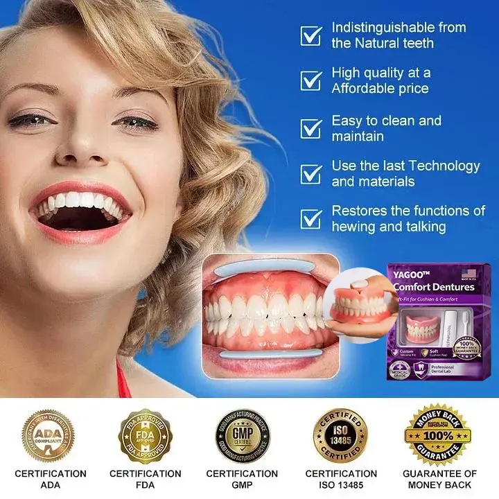 Instant Perfect Smile: Transform your smile instantly with the . Experience the satisfaction of achieving a flawless. customized fit right away. Our innovative denture set eliminates the discomfort of poorly fitting dentures. offering you a snug and natural feel that makes your dentures feel like a true part of your mouth. Say goodbye to sore spots and irritation as Denture Set provides immediate relief. allowing you to enjoy your smile with newfound confidence and comfort. Enjoy a seamless transition to a better-fitting. more comfortable denture experience without delay.