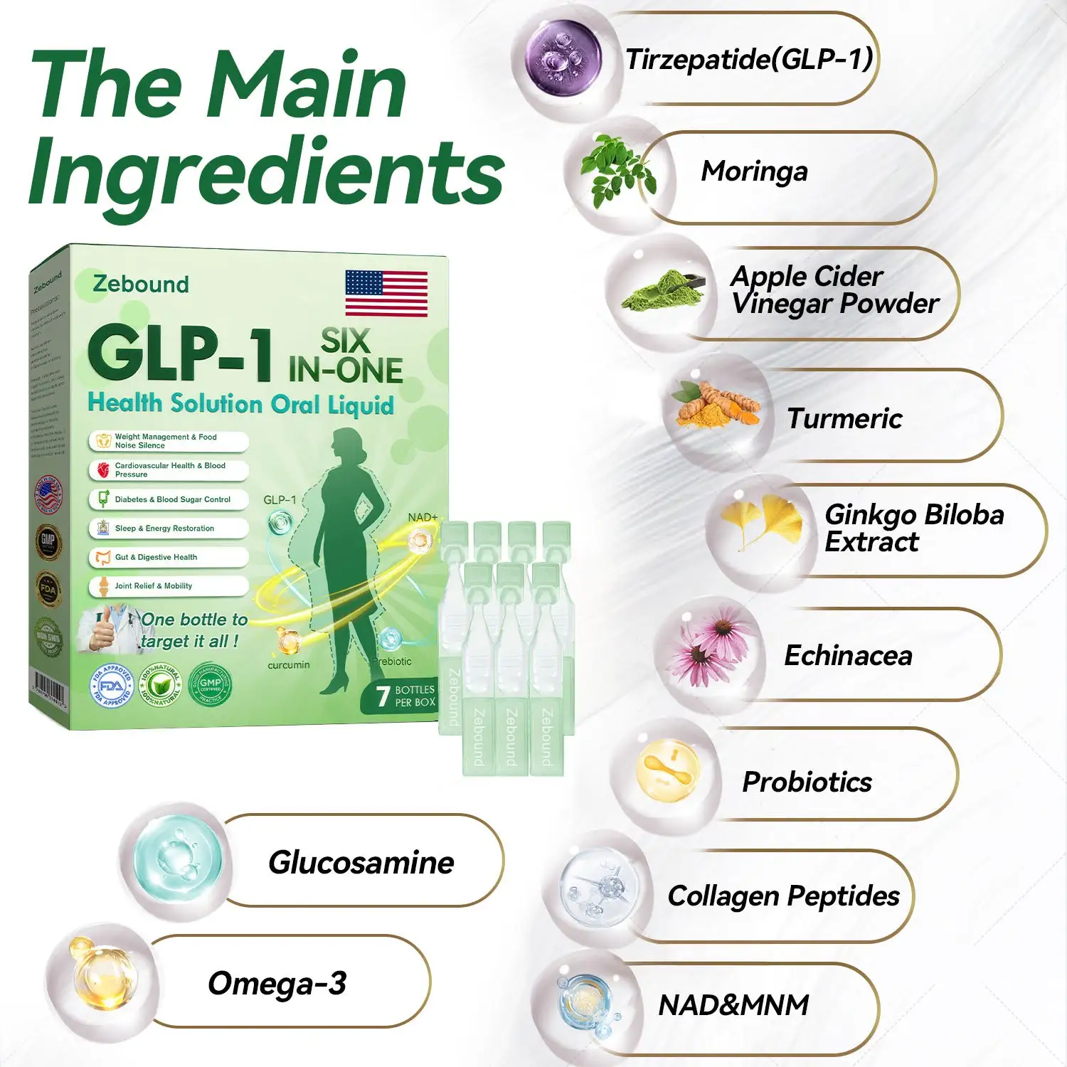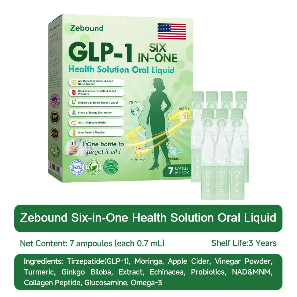 ZEBOUND GLP-1 SIX-IN-ONE Health Solution Oral Liquid was developed by a team of over 30 experts in international endocrinology and diabetology after more than 3 years of research. It combines Tirzepatide with powerful herbal ingredients to boost metabolism, accelerate addressing hormone imbalances and metabolic dysfunction, and support digestive and lymphatic health. This oral solution has been approved by the U.S. Food and Drug Administration (FDA) for its safety and efficacy, offering a scientifically backed solution for hormone imbalances and metabolic dysfunction and overall wellness.