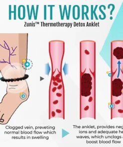 Zunis™ Thermotherapy Detox Anklet works by increasing tissue temperature. This results in improved blood flow, tissue metabolism, and connective tissue extensibility. It also releases negative ions which could increase the permeability of the cell membrane, to facilitate the absorption of tissue fluid into lymph vessels. Therefore prevent the blockage of the lymphatic system.