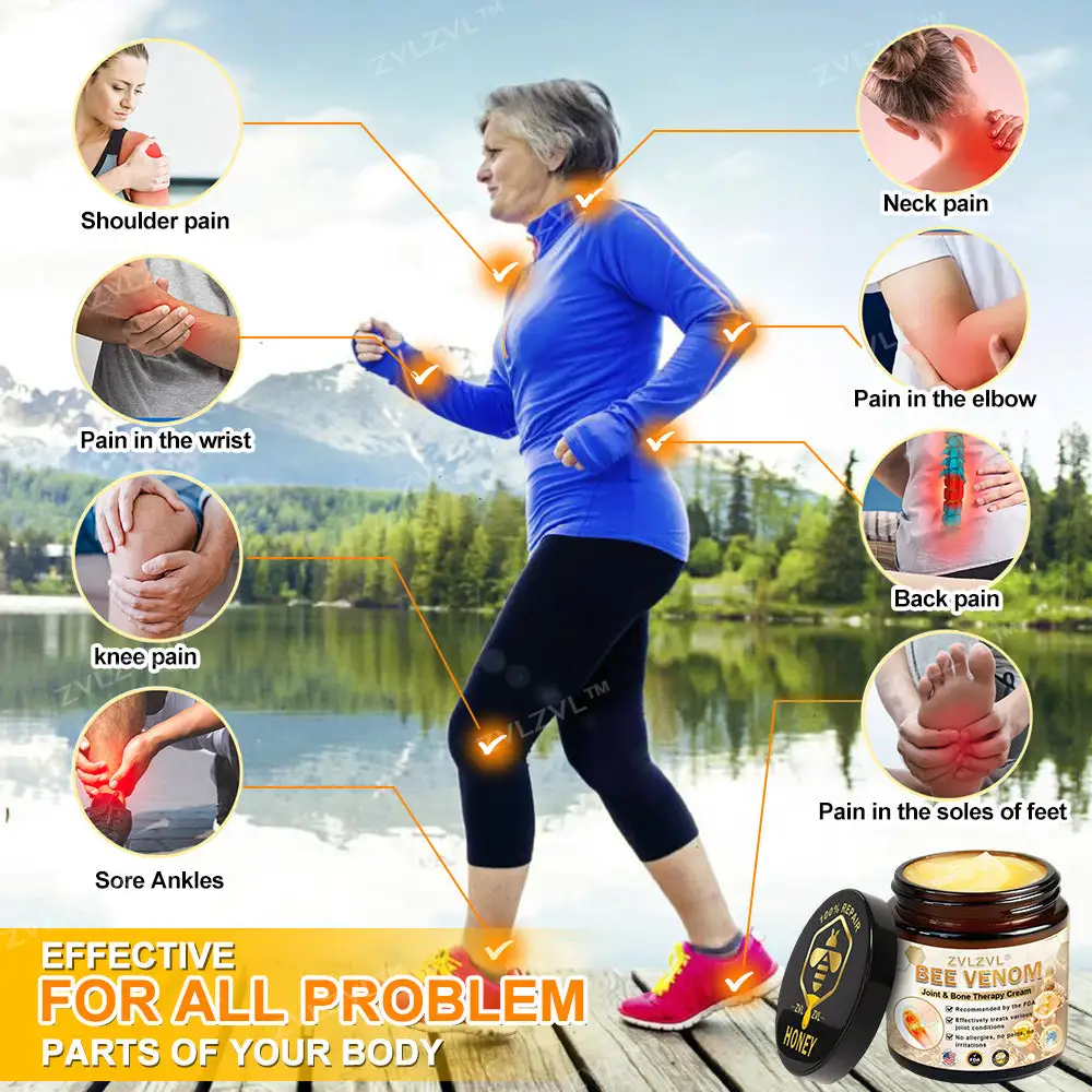 Our potent blend of glucosamine and chondroitin deeply repairs cartilage and fortifies joint structures. Combined with the anti-inflammatory and circulatory benefits of bee venom, it effectively combats joint inflammation, relieves pain, and promotes the healing of soft tissues and bones. With every use, significant relief follows, easing years of accumulated joint pain and stiffness, restoring mobility, and offering long-lasting protection.